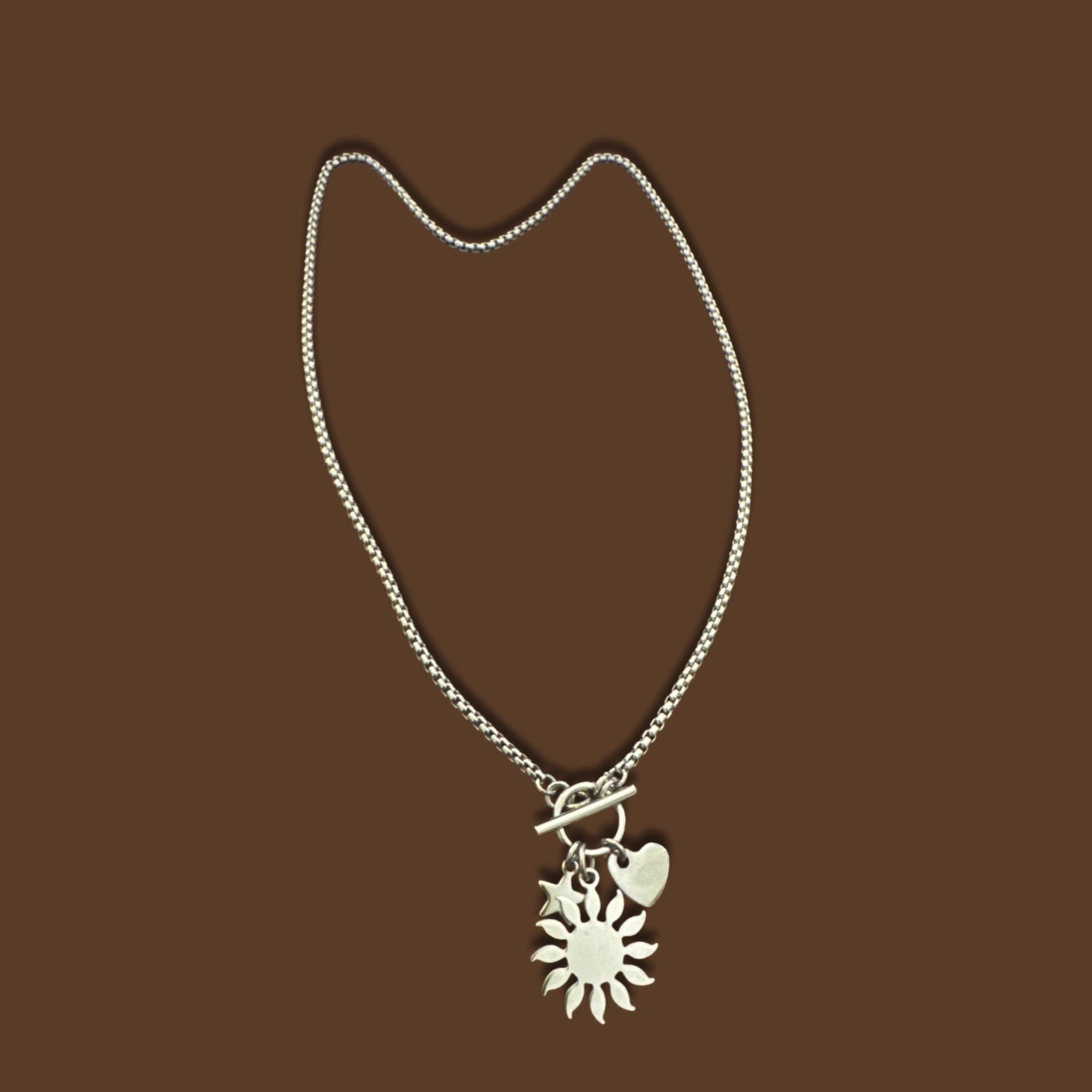 18" long, all stainless steel necklace on 3mm curved box chain and mixed pendants
